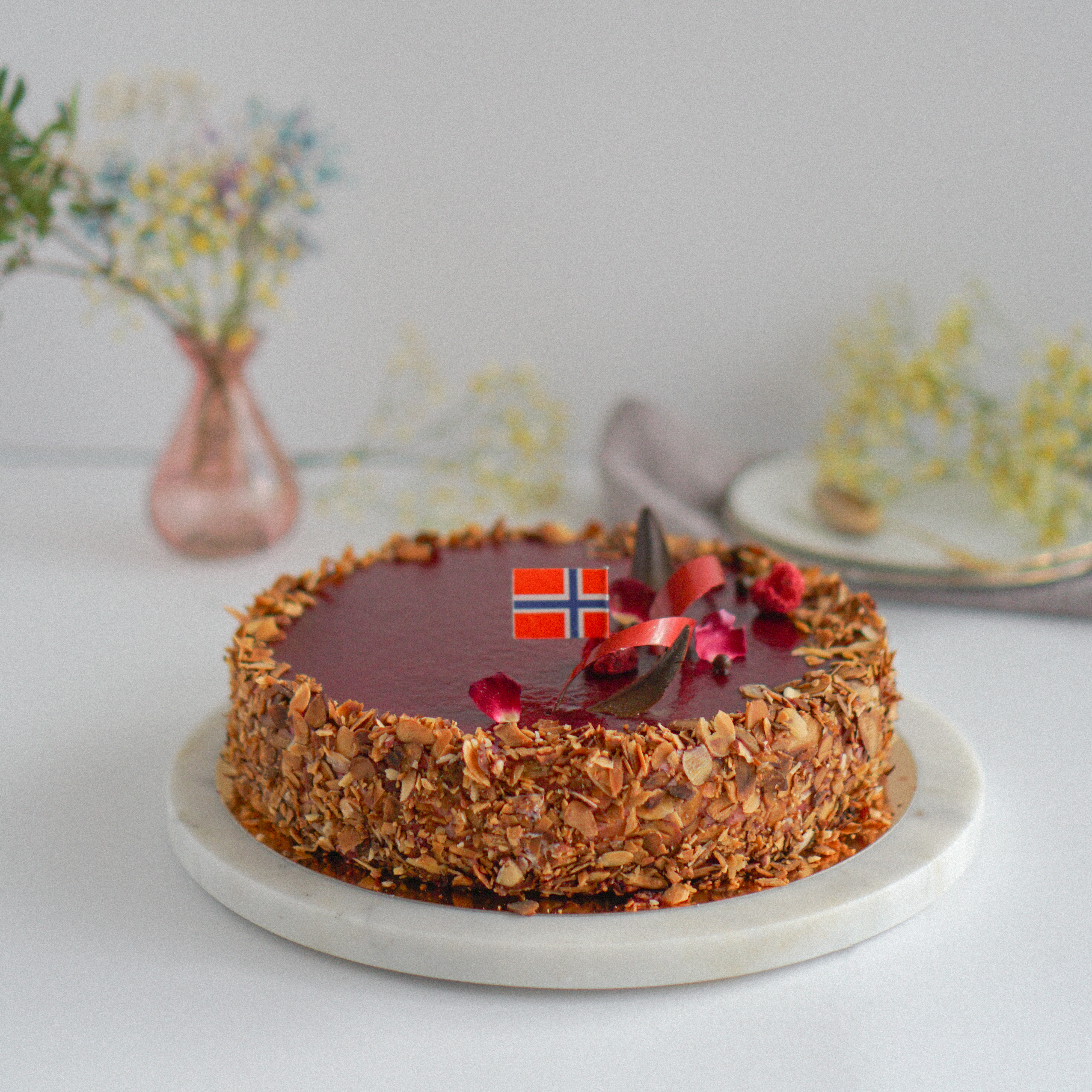 Vaniljemoussekake med skogsbær & mandelbunn22cm (10-12 kakestykker)